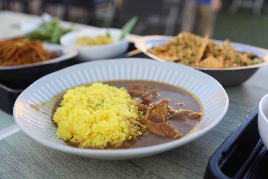 フードが全体的に黄色っぽい色味なのは、カレーがテーマだから。カレー専門店「ホクトカレー」がプロデュースしているそうです。スパイシーな香りと、元気がでるカラーに心が躍り、前のめりになって何種類ものフードをお皿に盛っていました。