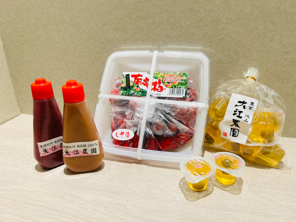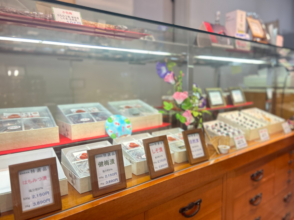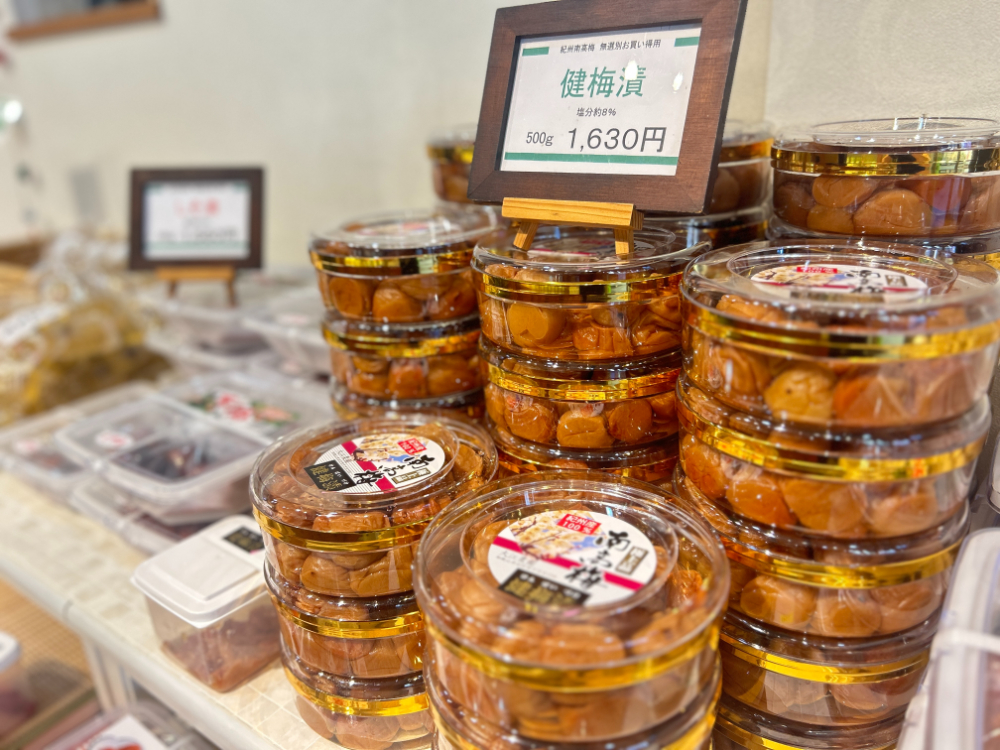 こちらの池上大江農園さんでは、自社農園・工場で作られた和歌山産「南高梅」の梅干しがずらりと並べられています。