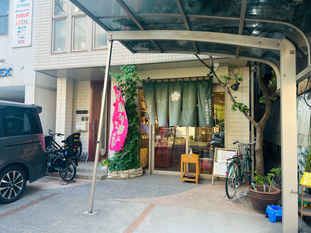 池上駅周辺を散歩していたら、店先のピンク色ののぼりに“手造り梅干し”とかかれたこんなお店を見つけました。