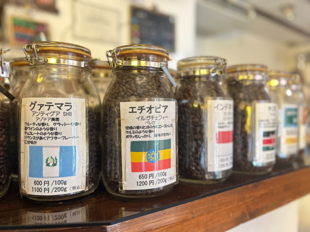 店内に入ってまず目に留まるのが、コスタリカ、ブラジル、エチオピア・・・と、珈琲素人の私でも知っている産地の豆が入った瓶が、カウンターにずらりと並べられている光景。
