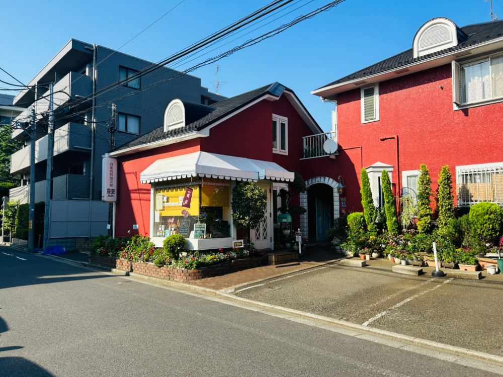 閑静な住宅街にある、赤い壁がかわいらしいお店です。