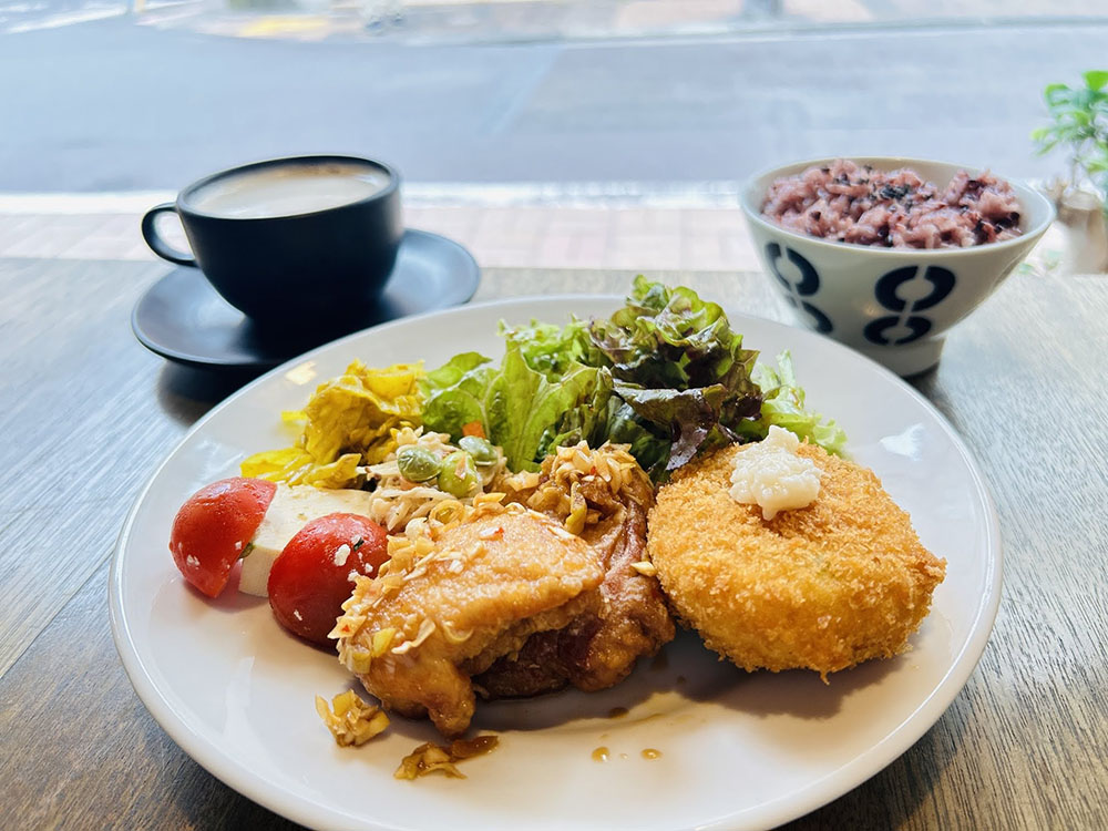この日のメインは、若鶏の唐揚げ ネギソースと枝豆とジャガイモのコロッケ 塩麹添え。副菜3種と付け合わせのサラダ、黒米ご飯がセットになっています。
