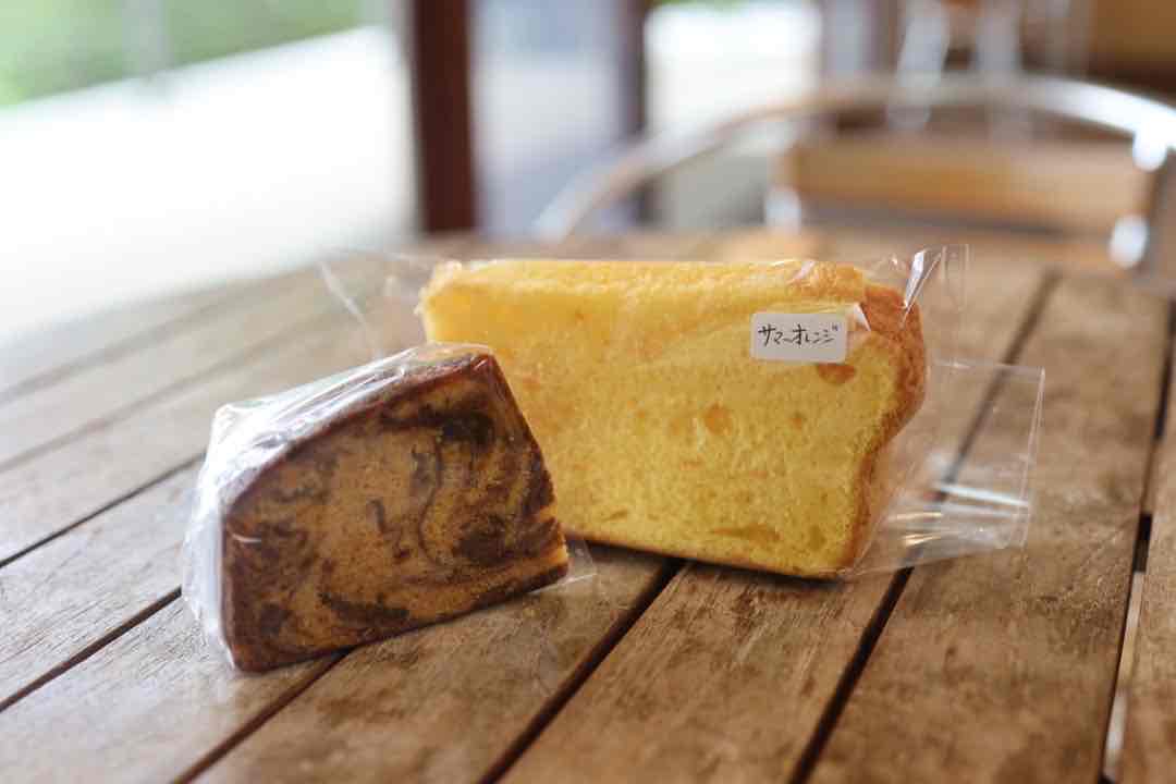 店頭に並ぶ焼き菓子は、日替わりでフレーバーが変化します。この日の魅力的なラインナップの中から、今回は「サマーオレンジのシフォンケーキ」(300円)「塩キャラメルチョコケーキ」(200円)をチョイスしました!