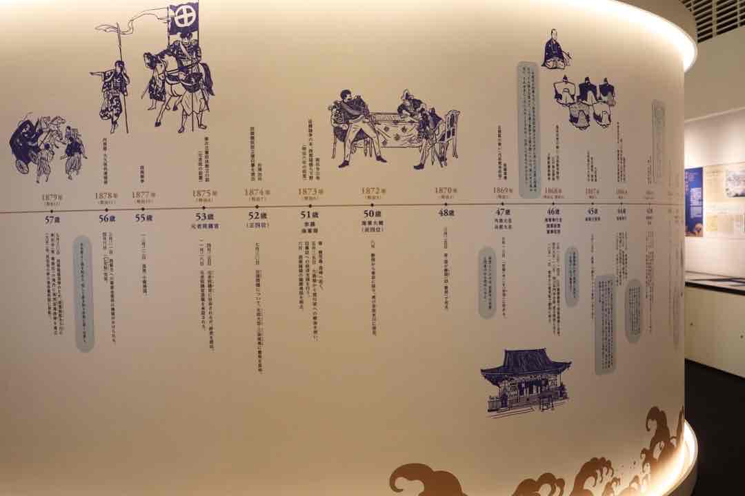 展示室の中心には、海舟に関する年表があり、坂本龍馬との出会いや、西郷隆盛との会談を経て江戸城を明け渡すことになる「江戸無血開城」などが紹介されています。