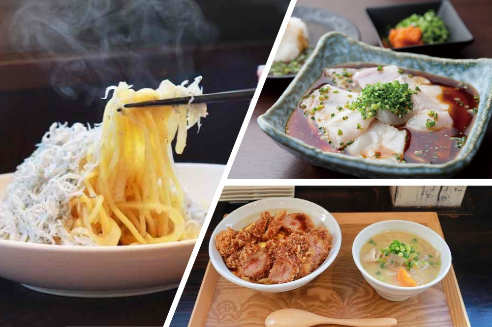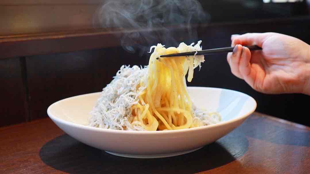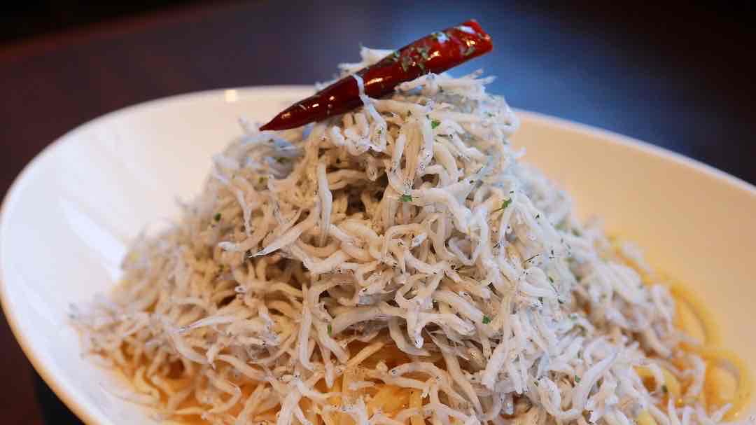「65Kitchen」の〆メニューとしてラインナップしている「山盛りしらすのペペロンチーノ(1,200円)」はしらすマウンテンでパスタ麺が隠れてしまうほどのボリューム。
