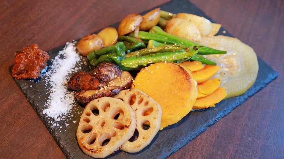 10種類の旬の野菜が乗った盛り合わせは、圧倒的なビジュアルのよさに大興奮!焼き立ての野菜からのぼる香りとキラキラとしていて鮮やかな表面の質感に食欲が刺激されました。