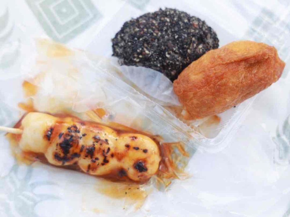 人気は「焼きだんご」90円 と「いなり」90円 とのこと。10本ほど出来上がった焼きだんごもみるみるうちに売れて行くので、タイミングを逃すまいと注文。餅菓子好きの私としては外せない「おはぎ ごま」150円 も購入し、いただきました。