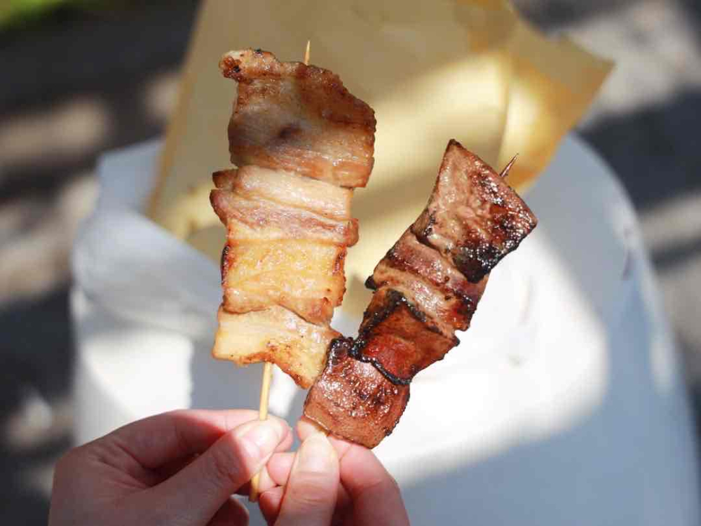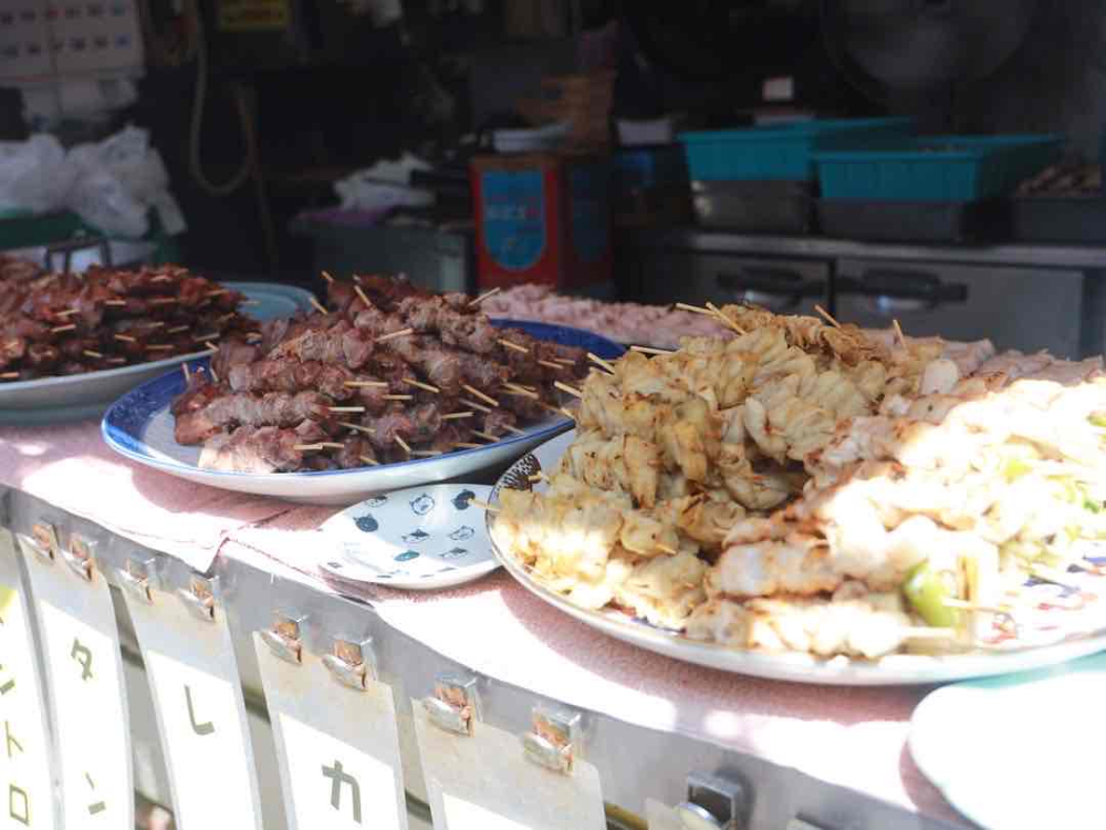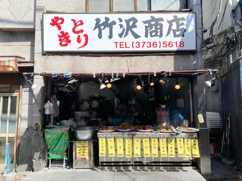 続いて立ち寄ったのは、「竹沢商店」です。盛り盛りに積み上がった焼き鳥と、通りに漂う焼き鳥の香りの煙がキャッチーすぎる!