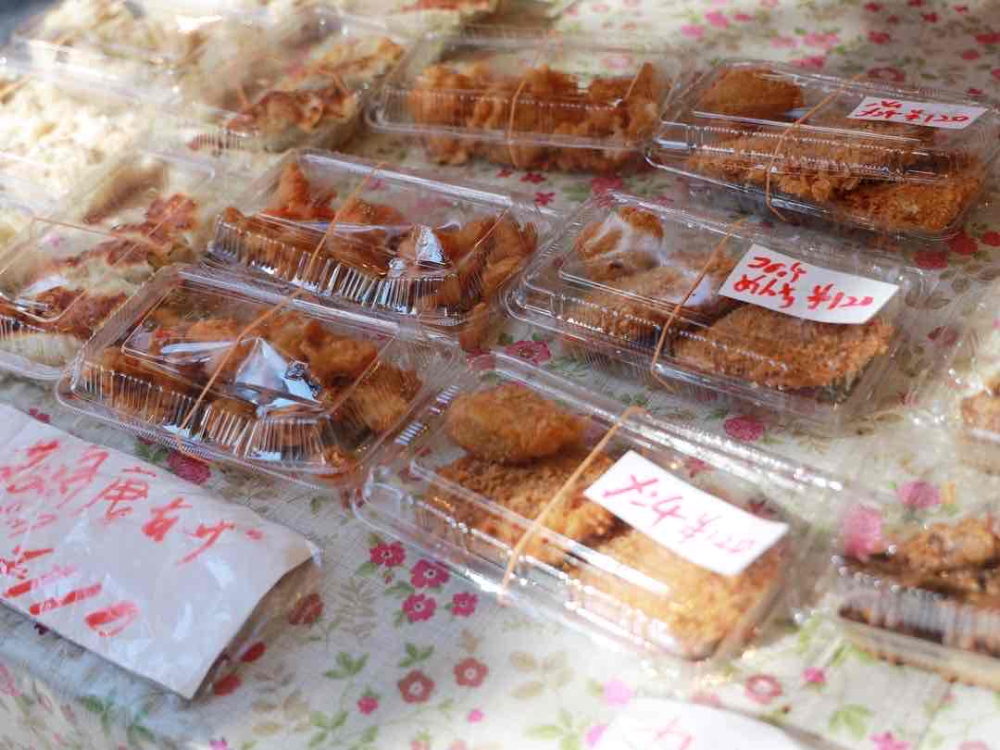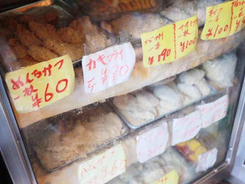 店先には、1パック110円の「若鳥揚げ」などリーズナブルなお惣菜が並んでいました。あれもこれも手に取りたくなるきつね色の揚げ物に、空腹時はとくに心が掴まれます。