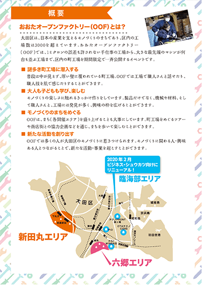 大田区は、日本の産業を支えるモノづくりのまちであり、区内の工場数は3000を超えています。おおたオープンファクトリー(OOF)では、1ミクロンの誤差も許されない手仕事の工場から、大きな最先端のマシンが何台も並ぶ工場まで、区内の町工場を期間限定で一斉公開するイベントです。