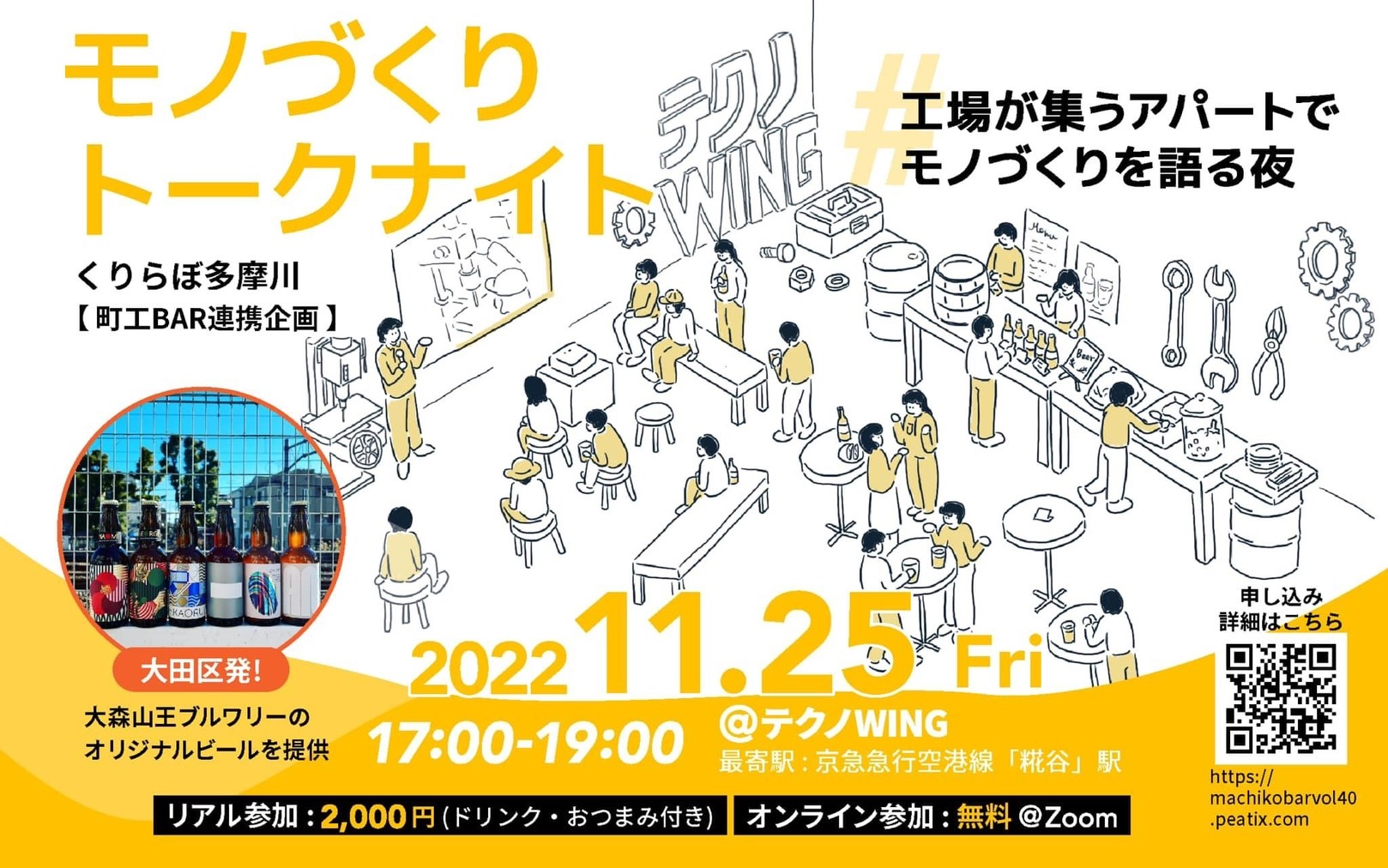 世界初の完全ワイヤレス型骨伝導イヤフォンを開発した会社などテクノWINGに入居する4社からゲストを招き、モノづくりに関するお話を伺います。また会場では、大田区でオリジナルビールを販売する大森山王ブルワリーとコラボしたビールを楽しみながらトークや 懇親会をお楽しみいただけます。