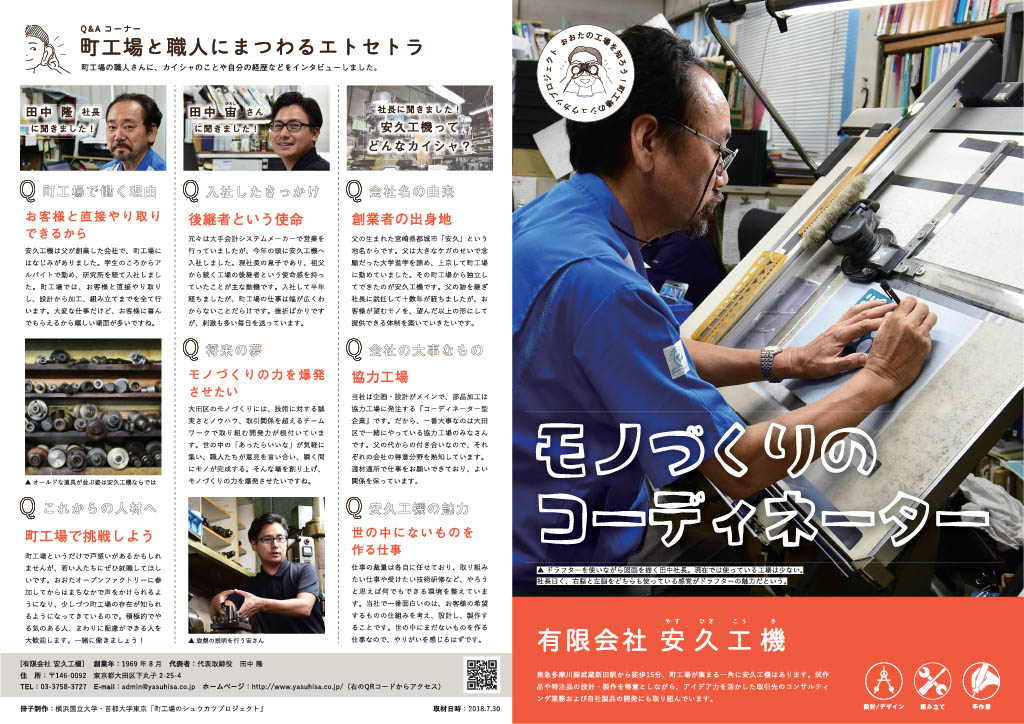 お客さんから持ち込まれるアイデアを形にするのが安久工機のお仕事、人呼んで「モノづくりのコーディネーター」。町工場ですが、最先端の機械はなく加工もあまりしません。経験と、アイデアと、大田の町工場のネットワークこそが安久工機の強みなのです。他の工場とは一味違った、「最前線」の町工場をご紹介いたします。田中さんの流暢なおしゃべりも必見です!