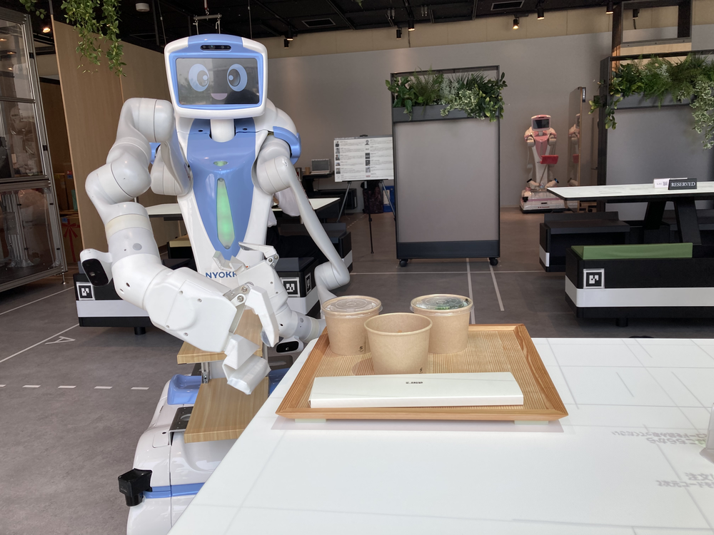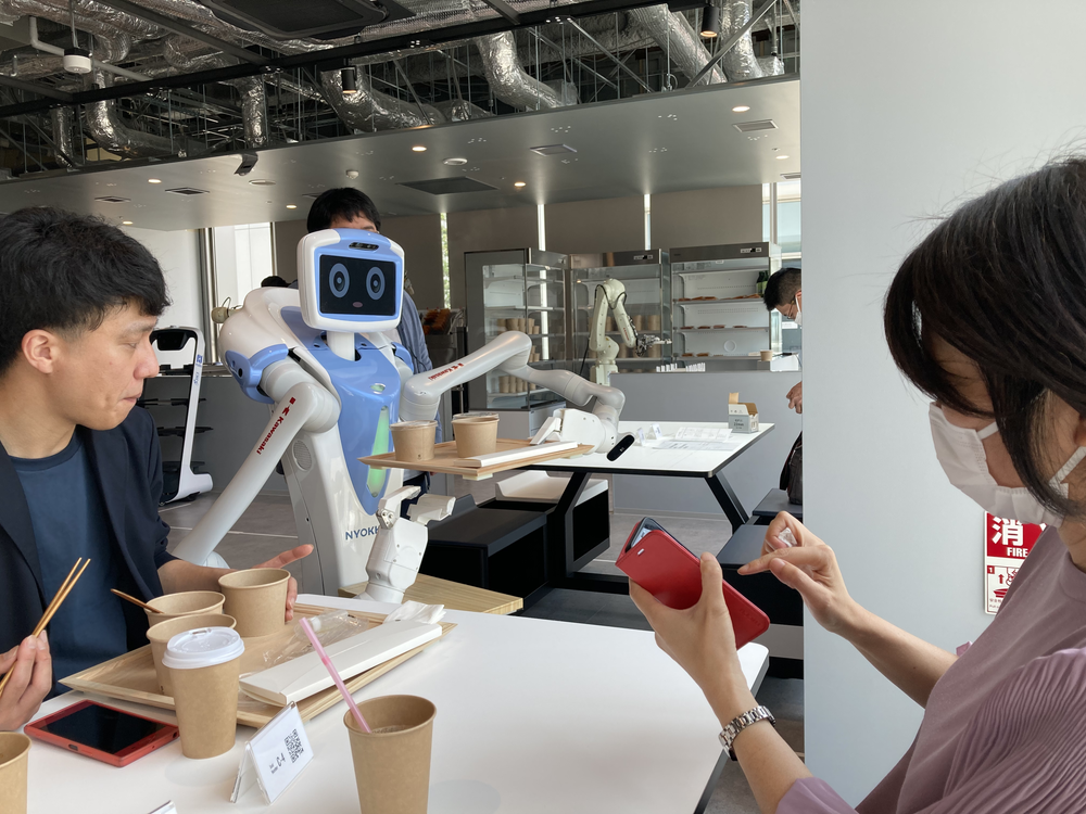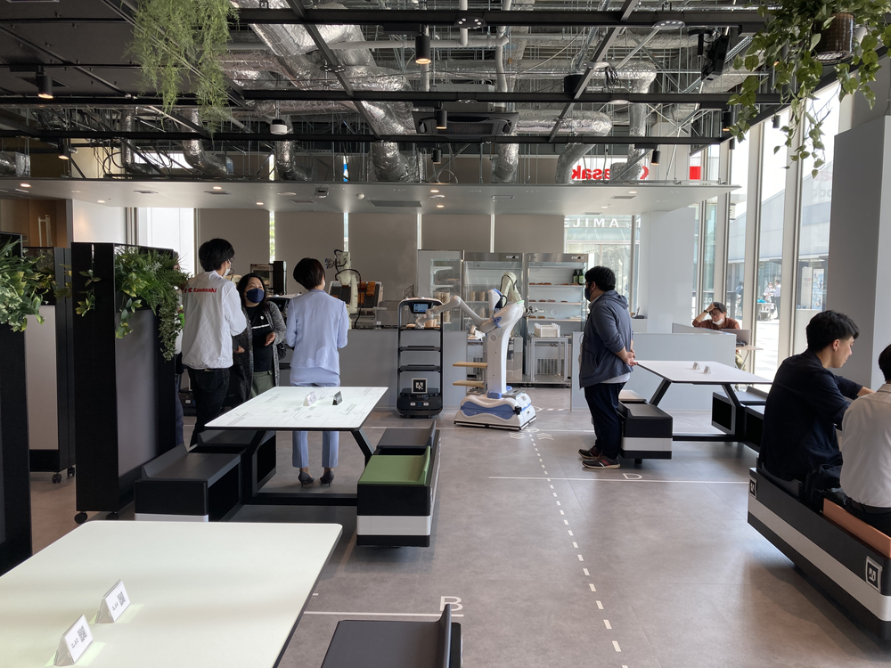 ロボットと人が出会い、共に社会課題を解決する川崎重工業(株)の実証実験の場でもある。店内に入り携帯画面から料理を注文・決済すると、ロボットが料理を運んできてくれ、未知の体験ができる近未来型レストラン。ロボット展示場のような雰囲気もある。