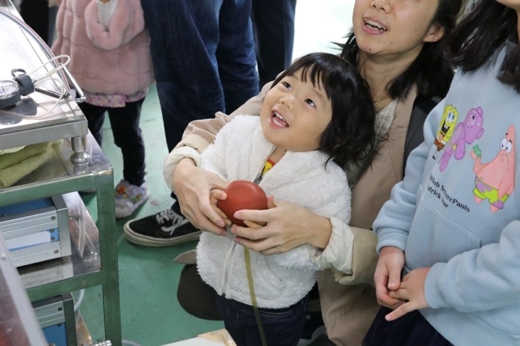 心臓の性能を見せる展示を触り、笑顔を見せる子供