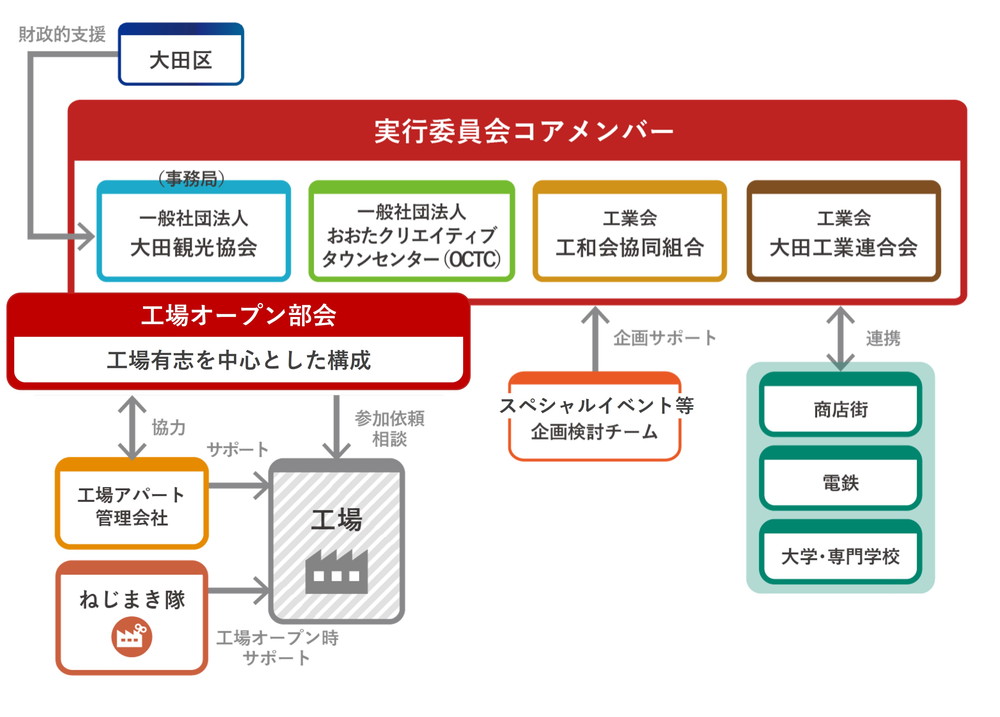 おおたオープンファクトリーは実行委員会形式で企画・運営に当たっています。一般社団法人大田観光協会を事務局とし、地元工業団体の大田工業連合会と工和会協同組合、一般社団法人おおたクリエイティブタウンセンター、横浜国立大学、東京都立大学等が中心的役割を担い、これに参加工場、商店街、電鉄、市民団体が連携し、そしてボランティア組織「ねじまき隊」(※)をはじめ、区内のさまざまな企業・団体や大田区のサポートを得て運営されています。