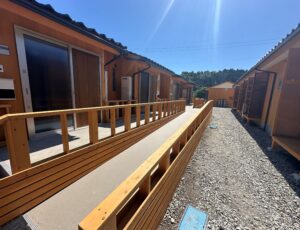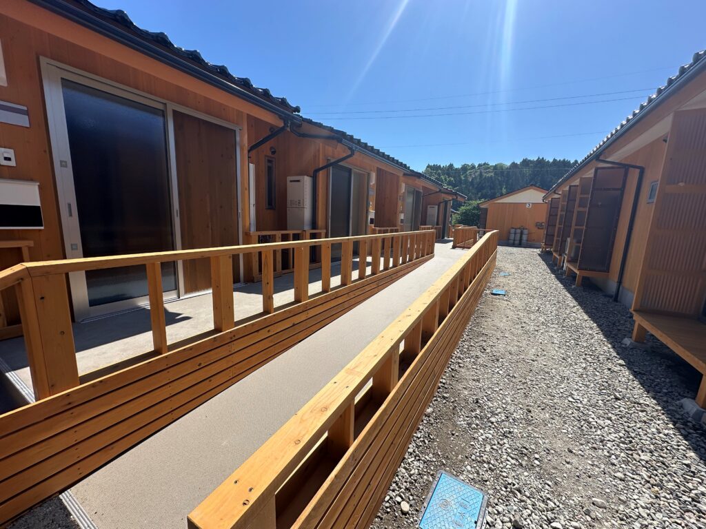 建方実演: 自社大工による一日での仮設住宅建設のデモンストレーション。目の前で大きな家が組みあがる、迫力満点のイベントです。建設には全国木造建設事業協会の標準に基づいた方法を採用します。