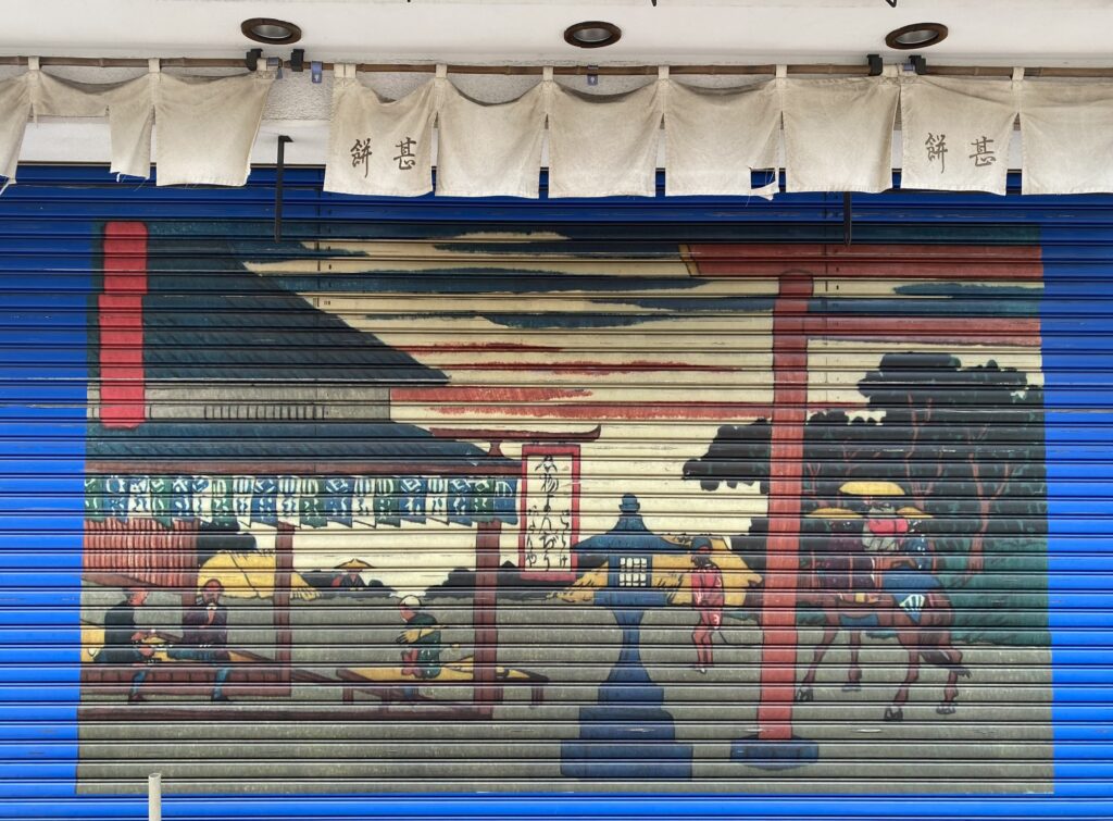 かつては旅人の休憩のために設けられた「間の宿」としてにぎわい、麦わら細工などが土産物として売られていました。近年、商店街では看板や提灯、浮世絵の描かれたシャッターなどを整備し、かつての江戸の街並みを演出しています。